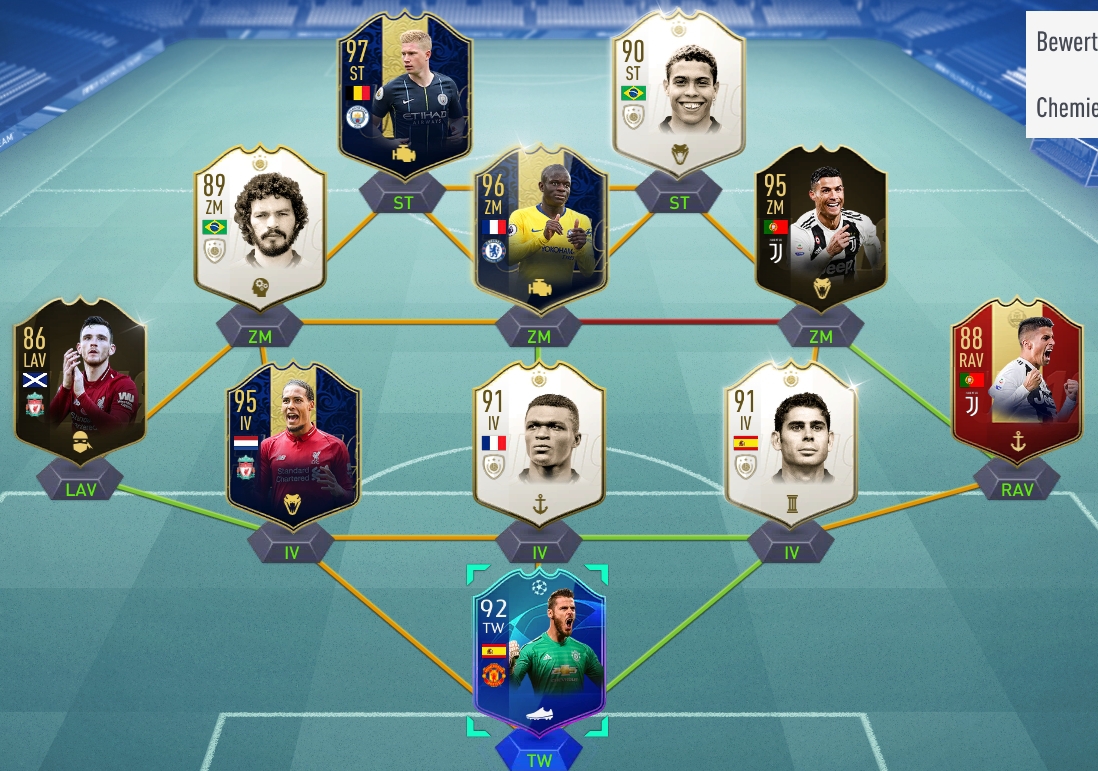 Die Abwehrreihe ist ein echtes Bollwerk. Eine minimale Veränderung gab es auch auf der RV-Position. Dort löste Cancelo OTW den roten 88er Cancelo temporär ab. Der OTW muss wahrscheinlich bald wieder weichen, weil er vor allem aus Trading-Gesichtspunkten im Verein ist und es Verschwendung wäre, den roten Cancelo verhungern zu lassen.