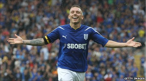 Saisonauftakt gegen Cardiff Aufsteiger hält sich gut, verliert knapp Es war ein klasse Auftakt für Birmingham und Cardiff. Der Zweitligameister zeigte sich würdig für die erste Liga. Doch zuerst begann es garnicht gut. In der 4.Minute sah Nile Ranger neben sich McPike und legte rüber. Nach einer kurzen Drehung hatte er keine Mühe und netzte ein. In der 21.Minute dann der Pausenstand, durch Ranger. Nach einem herrlichen Doppelpass mit Jerome schob er ihn lässig in die rechte Ecke. Doch es hätte auch 3-0 stehen können, die Szene der ersten Hälfte gab es in der letzten Minute. Eine Ecke von Sammons erreicht Jerome, doch seinen Kopfball lenkt Marshall an die Latte, den Nachschuss von Parnaby aus fünf Metern kann er ebenfalls parieren. Nach seinem 2-3. der Superstar - Craig Bellamy In der zweiten Hälfte waren die letzten sechzehn Minuten noch einmal ereignisreich, sonst war nichts los. Zuerst konnte Superstar Craig Bellamy auf 1-2 verkürzen (74.), doch direkt danach traf erneut Ranger, dessen Transfer sich schon jetzt gelohnt hat. Zehn Minuten vor Abpfiff noch einmal der große Auftritt ds Walisers, Bellamy. Aus 30 Metern zirkelt er einen Ball halbhoch ins lange Eck. Foster konnte das 2-3 nicht verhindern. Doch man konnte den knappen Vorsprung bis zum Ende halten. Die gute Stimmung versaut die Verletzung von Aliaksandr Hleb. Der Weißrusse wird vermutlich drei Monate ausfallen. Im Topspiel konnte sich keiner durchsetzen. Liverpool und Manchester United trennten sich torlos. Chelsea dagegen konnte die Aufgabe im Stadtderby bei den Tottenham Hotspur mit bravour lösen. Ein Doppelpack von Ramires reichte den Blues. Als nächstes trifft Birmingham City auf Aston Villa und die Spurs. Das 1-0 vom Superstar - Didier Drogba _______________________ | |
