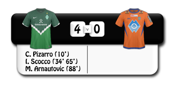Zitat: | Bin schon gespannt auf mehr :3 | Bittesehr ^^ PFLICHTAUFGABE ERFÜLLT  Der SV Werder Bremen hat im Vorbereitungsspiel gegen Aalesunds FK aus Norwegen seine Klasse bewiesen. Der in der Tippeligaen zuletzt häufig abstiegsbedrohte Klub kam in Norddeutschland mit 4 : 0 unter die Räder. Den Anfang machte der Publikumsliebling Claudio Pizarro: In der 10. Minute musste er bei einer flachen Flanke von Nauru nur den Fuß hinhalten, um den Torwart zu überwinden. Dann begann die Show des "Nacho". Torsten Frings, der die gesamte Partie über mit guter Übersicht und tollen Pässen aus dem Mittelfeld glänzte, schickte Scocco auf die Reise. Zwei relativ gute Chancen hatte der Argentinier, der erst vor kurzem aus Athen an die Weser gewechselt war, schon vergeben, doch in der 34. Minute blieb er ganz cool und schob den Ball frei vor dem Torwart ins Netz. Ähnliche Szene in der 65. Minute: Scocco war auf die linke Seite gewechselt und wurde diesmal vom eingewechselten Arnautovic in den Strafraum geschickt - es war keine Ballannahme nötig, der technisch versierte Südamerikaner schlenzte den Ball volley ins Tor. Kurz vor Schluss bekam Aalesunds eine gute Freistoßchance, doch die wurde kläglich vergeben und aus dem darauf folgenden Konter resultierte sogar noch der Endstand: Das 4 - 0 erzielte der Österreicher Arnautovic nach einem wunderbaren Zuspiel von Scocco. "Alles andere als ein Sieg wäre heute peinlich gewesen", sagte Arnautovic nach dem Spiel. "Wir haben den qualitativ schwächere Mannschaft klar beherrscht, uns viele Chancen rausgespielt und verdient gewonnen." Besonders imponiert hat uns heute die Leistung von Ignácio Scocco - der Neuzugang erzielte zwei Tore und bereitete eines vor. Klasse! | |