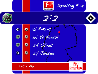 Hannover. Nachdem starken Auftritt zu Hause gegen Hoffenheim, rettet Marcell Jansen dem HSV zumindest einen Punkt gegen Hannover. Trainer Fink musste nach dem Spiel feststellen, dass "die Konstanz, die wir brauchen, um dauerhaft oben in der Tabelle mitzuspielen noch nicht da ist". Dabei begann das Spiel in Hannover wieder viel versprechend für die Hanseaten. 96 hatte in der Anfangsphase noch keinen Zugriff auf die spielstarke HSV-Offensivreihe. Besonders "El Karussell" Maicosuel hatte Freude an seinen Tänzen mit der gegnerischen Abwehr gefunden. Der Brasilianer glitt durch die Abwehrreihen wie ein nasses Stück Seife zwischen den Händen. Seine Handschuhe eingeseift hatte wohl auch 96-Schlussmann Zieler, dem nach gut einer viertel Stunde ein Schuss von Maicosuel aus den Händen glitt. Der Ball landete daraufhin vor den Füßen von Mladen Petric, dessen 11. Saisontor wohl zu der Kategorie "Pflichtaufgabe" gehörte. Leider war das 1:0 in der 16. Minute auch schon der einzige Höhepunkt in der ersten Halbzeit, die in der Folge sehr verflachte. Spielerisch ging auf beiden Seiten nichts mehr zusammen und die Fans hofften auf Besserung in Hälfte 2. Die wurde durchaus sehenswerter, vor allem, weil Hannover jetzt das Zepter in die Hand nahm und aktiver wurde. Besonders mit der Einwechslung von Stindl machte Slomka alles richtig. In der 64. Minute bereitete er das 1:1 mit einer zielgenauen Flanke auf Ya Konan vor und machte zehn Minuten später sogar noch die Führung für die Hausherren (74'). Bei beiden Gegentoren sah die HSV-Abwehr mal wieder nicht gut aus. Viel zu viel Platz für den Gegner, unerklärliche Aussetzer und ein machtloser Drobny. Thorsten Fink tobte an der Außenlinie und brachte mit Son und Töre zwei Neue in die Partie. In der Schlussviertelstunde wachten die Gäste dann wieder aus ihrem kollektiven Tiefschlaf auf und spielten wieder Fussball. Mit neuem Antrieb blieb der HSV auch nicht lange unbelohnt und kam durch Jansen noch zu einem 2:2. Nach einem Flankenlauf von Son hatte sich der bullige Linksfuß im Strafraum durchgesetzt und vollendete aus kurzer Distanz gegen Zieler. Im Nachhinein muss man mit den Punkt zufrieden sein, meinte Torschütze Marcell Jansen. "Eine halbe Stunde guten Fussball zu spielen reicht in der Bundesliga halt meistens nicht aus, um drei Punkte zu holen", ergänzte er. Im nächsten Spiel gegen den Club steht dann Kapitän Westermann wieder zur Verfügung und bringt hoffentlich etwas mehr Ordnung in die HSV-Abwehr.