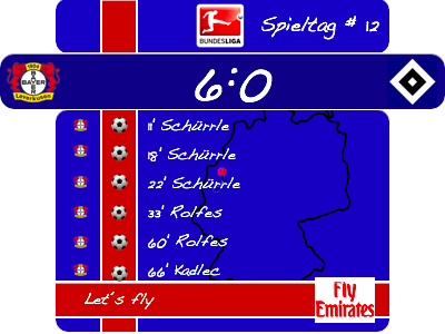 Leverkusen. Bayer Leverkusen erwischte einen Sahnetag und nahm den HSV nach Belieben auseinander und gewann auch in der Höhe verdient gegen die Fink-Elf. Es war einer dieser Tage, an dem alle Hamburger mit dem falschen Bein zuerst aufgestanden sein müssen. Trainer Fink wollte gegen Bayer gerade hinten möglichst sicher stehen und spielte wieder eine defensivere Variante mit zwei 6ern im Mittelfeld. In einem für Bayer denkwürdigem Spiel blieb es aber nur 11 Minuten bei einem 0:0, dann schoß Drobny den ersten Bock, indem er einen Abstoß direkt in die Füße von Nationalspieler Schürrle schlug. Der bedankte sich artig mit dem 1:0 für die Hausherren. Eine Minute später die nächste Hiobsbotschaft: Der Japaner Son verletzte sich in einem Zweikampf und musste kurze Zeit später durch Guerrero ersetzt werden. Wer beim HSV heute im Sturm stand, war allerdings egal, denn über die Mittellinie kamen die Gäste erst gar nicht. Leverkusen brannte in der ersten halben Stunde ein regelrechtes Feuerwerk ab. Besonders Schürrle war von der Hamburger Verteidigung überhaupt nicht in den Griff zu bekommen und erzielte binnen 11 Minuten einen lupenreinen Hattrick, so dass Leverkusen nach 22 Minuten bereits mit 3:0 in Front lag. Rolfes erhöhte im Nachschuss eines Ballack-Krachers noch vor der Pause auf 4:0. Dieses Ergebnis rettete Drobny in die Halbzeit, in der Fink an die Ehre seiner Spieler appellierte und das Resultat zumindest für die mitgereisten Fans etwas freundlicher gestalten wollte. Von Besserung auf Seiten des HSV war jedoch auch in der zweiten Halbzeit keine Rede. Leverkusen dominierte weiter nach Belieben und Rolfes traf in der 60. Minute zum zweiten Mal und erhöhte damit auf 5:0. Daraufhin erlaubte sich Trainer Dutt den Luxus, Kapitän Ballack auszuwechseln und brachte den jungen Ortega. Das Übel nahm für die Hamburger aber kein Ende, nur für den HSV-Kapitän Westermann der zwischen der 63. und 65. Minute zweimal gelbwürdig Schürrle stoppen musste und daher mit der Ampelkarte unter die Dusche geschickt wurde. Petric wurde zu Gunsten eines weiteren Verteidigers aus dem Spiel genommen und wurde durch Bruma ersetzt. Der war noch keine Minute auf dem Platz, als er gegen Kadlec im Zweikampf das Nachsehen hatte und nur hinterher schauen konnte, wie der Tscheche den 6:0-Endstand erzielte. Die letzten 25 Minuten der Partie schaltete die Werkself dann 2-3 Gänge runter, so dass der HSV keinen weiteren Gegentreffer hinnehmen musste. Die Bilanz: 18:0 Schüsse auf das Tor, 5:0 Ecken und 3:0 Punkte für Bayer Leverkusen. Nachdem Spiel versuchte Fink die angemessenen Worte für dieses Debakel zu finden: "Ich habe so etwas noch nicht gesehen, aber heute können wir mit dem Ergebnis glücklich sein. Allerdings verliere ich lieber einmal 6:0 als sechsmal 1:0 und hoffe, dass wir uns bis zum nächsten Spiel wieder erholt haben!"