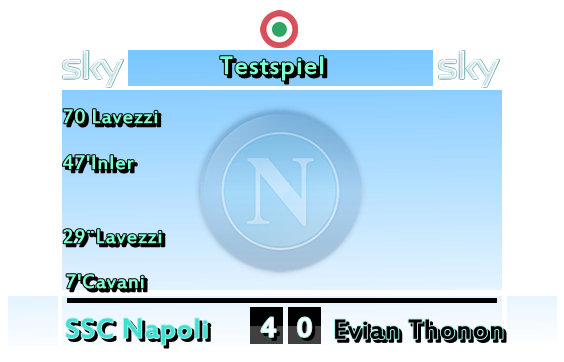 Stimmen zum Spiel: Antonio Sparetta (GdS):"Sie waren heute der beste Spieler auf dem platz, wie kommt es das Sie so in Form sind?“ Marek Hamsik:"Ich hab einfach mein Spiel gespielt, trainierte die letzten Woche hart trotz gewissen Spekulationen und fühle mich wohl unter Paulo Bento." Antonio Sparetta (GdS):"Ihr 1 Testspiel und gleich 4:0 dennoch ein gutes Ergebniss oder nicht?“ Paulo Bento:"Auf jedenfall! Wir haben heute als Mannschaft gezeigt was wir können trotz diesen Spekulationen und Unruhen in denn letzten Tagen. Mich freut das für die Mannschaft." Tippspiel: Pinola und Speedy haben richtig getipp und kriegen jeweils 8 Punkte. | |