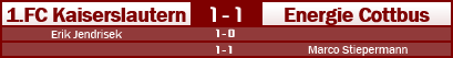 Gegen Energie Cottbus gab es ein Remis was keinen zufrieden stellen konnte. Jendrisek und Stiepermann sorgten für die Tore beim 1:1, bei dem Cottbus sogar hätte gewinnen können. Mehrmals stand aber der starke Sippel und der Pfosten im Weg.