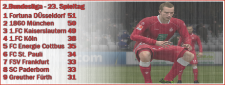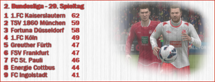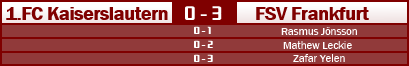 Nach den souveränen Siegen gegen Dynamo Dresden und dem 1.FC Köln kam das große Nervenflattern gegen den FSV Frankfurt. Selbst Ilsö, der gegen Köln noch mit einem Freistoßtor den vierzehn Punkte Vorsprung perfekt machte konnte nicht treffen. Dafür taten es die Gäste in Person von Jönsson, Leckie und Zafar Yelen. Eine deutliche Niederlage.