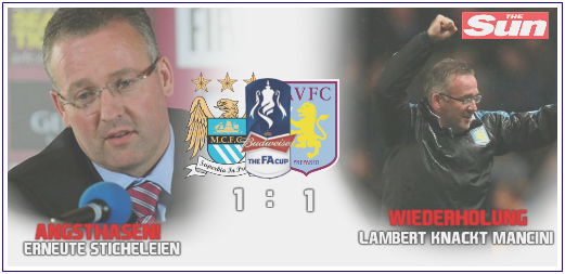 Es ging also in die Verlängerung und das freute alle im Stadion, außer den Trainern und Spielern. Doch dann wurde es noch einmal lauter und auf einmal explodierte es auf den Rängen! Bannan trat zum Eckball an und brachte ihn auf den Elfmeterpunkt. Lescott verschätzte sich und tauchte unter dem Ball hindurch und Ricky van Wolfswinkel kam zum Kopfball. Per Aufsetzer flog das Leder an Joe Hart und Nasri vorbei ins Tor, Villa führt! Auf den Rängen gab es kein Halten mehr, die Spieler auf dem Feld sprinteten gemeinsam zur Eckfahne und ließen ihrer Freude freien Lauf und auch Lambert wurde von den Reservespielern und Verantwortlichen erdrückt. Das Spiel war damit entschieden, denn in der zweiten Halbzeit der Extraminuten warfen sich die Villans in jeden Ball und hielten dem Druck stand - Manchester City ist draußen!