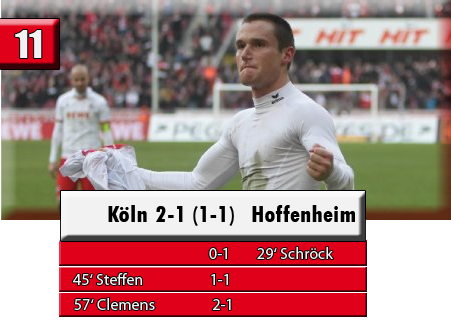 Zwölf Minuten nach dem Wiederanpfiff setzte sich Christian Clemens in Szene. Aus halblinker Position nahm er den Mut zusammen und schlenzte den Ball in Richtung des langen Ecks – und er passte! Die Führung für Stanislawski und seine Mannschaft! Acht Minuten später hätte Jankowski die endgültige Entscheidung herbeiführen können, doch am Ende reichte es auch so zum ersehnten Dreier gegen Hoffenheim.  Aufstellung: Horn - Contento|Heintz|Knoche|Vargas - Matuschyk - Schindler|Royer - Clemens - Steffen|Wallyson