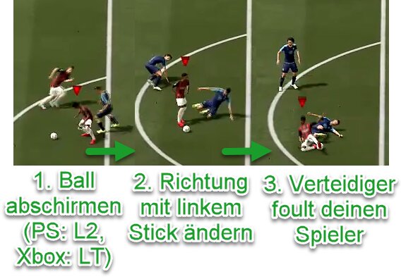 Wenn du deine Laufrichtung schnell änderst, foult dich dein Gegenspieler oft unabsichtlich. Grund: Dort, wo bisher noch der Ball war, ist jetzt nur noch der Körper deines Spielers.