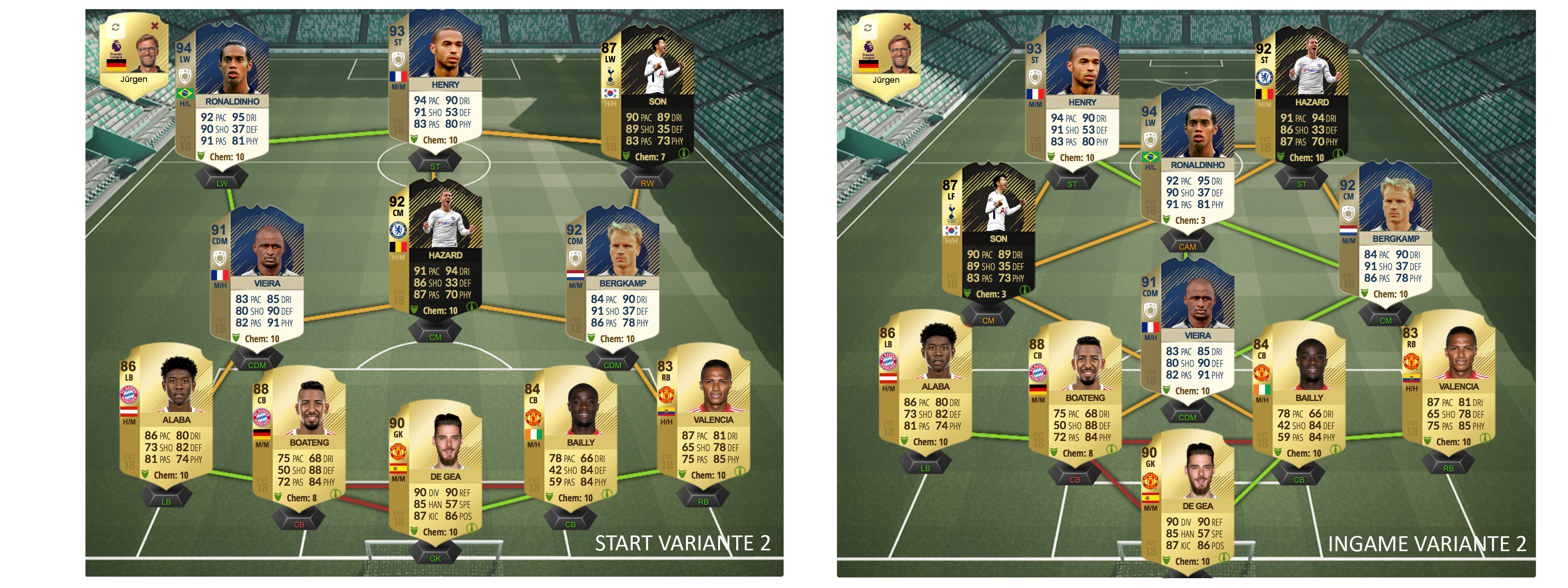 Mit wachsenden Coins habe ich dann ein wenig umgebaut und auch mal Packluck gehabt. Habe mir dann noch Blanc zugelegt. So sieht/sah mein Team aus (Son, Bergkamp, Vieira, Henry, Ronaldinho, Bailly sind untauschbar).