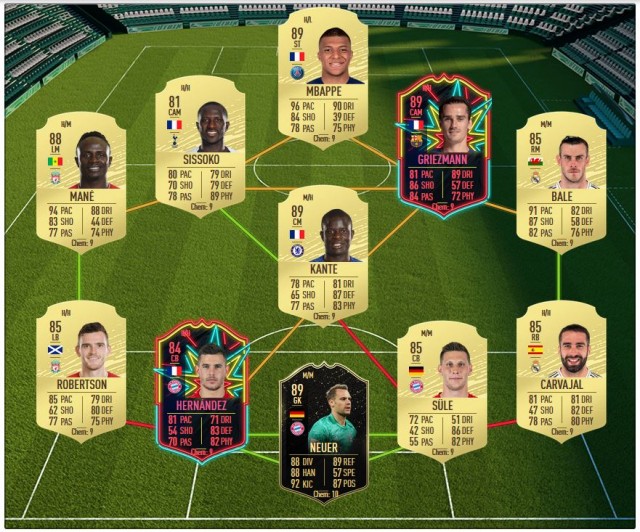Für Sane, der auch eher mittelmäßig agiert hatte (ähnlich wie in FIFA 19), kam jetzt Mane neu ins Team. Damit das mit der Chemie auch passt, beerbt Robertson den bisherigen LV Alaba. Schwere Entscheidung, da Alaba echt sau stark ist, aber was tut man nicht alles für die perfekte Chemie. An Robertson habe ich, auch wenn es der IF war, aus FIFA 19 noch sehr gute Erinnerungen.