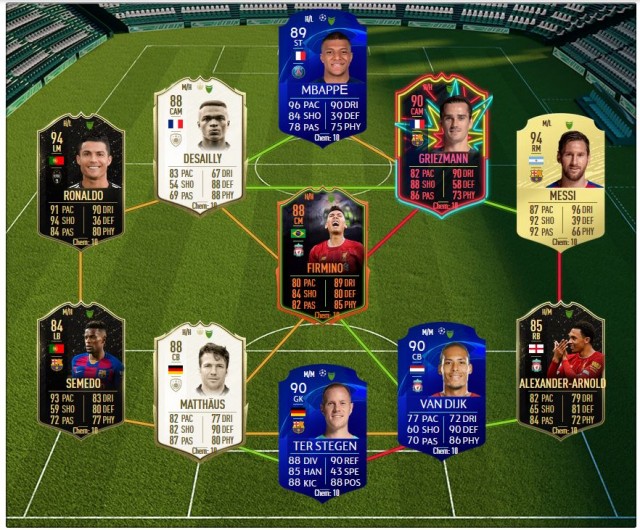 Ich spiele nun (wieder einmal....) mit CR7 im Sturm. Dessen Partner ist nun nicht mehr Ian Wright (bleibt weiterhin eine super Empfehlung!!) sondern Griezmann OTW. Griezmann deswegen, da ich einen guten Link zu Messi erhalte und er auch als CAM und als zweiter Stürmer neben CR7 agieren kann.