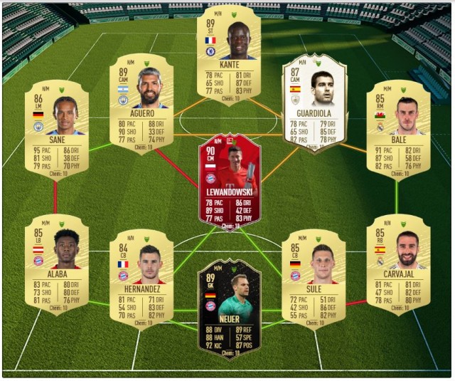 Kante und Guardiola bilden das zentrale Mittelfeld, Sane und Bale sind auf den Flügeln und Lewandowski (Benzema) und Aguero bilden den Sturm.