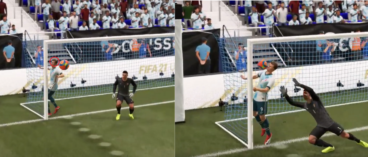 Klar, er muss eigentlich nur hochspringen. Passiert aber auch im RL, dass sich der auf der Linie den Ball selbst reinköpft. So einen habe ich gerade auch verwandelt, Gegner auf der Linie und direkt über den Scheitel gezogen.