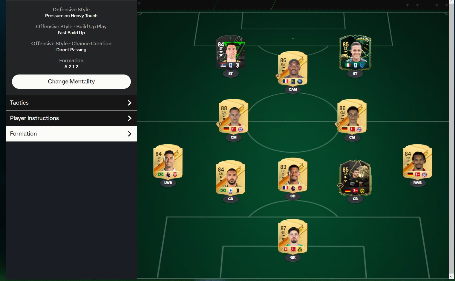 Imho ist die 5-2-1-2 die ausgeglichenste Formation für das Spiel. Defensiv hat man zwei Abräumer vor der 3er Kette, so dass das Zentrum eigentlich immer dicht ist. Auf den Außenbahnen braucht man aber zwingend extrem schnelle Leute. Sane ist da perfekt, Martinelli einen Hauch schlechter.