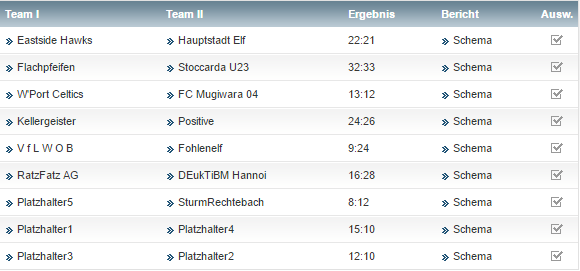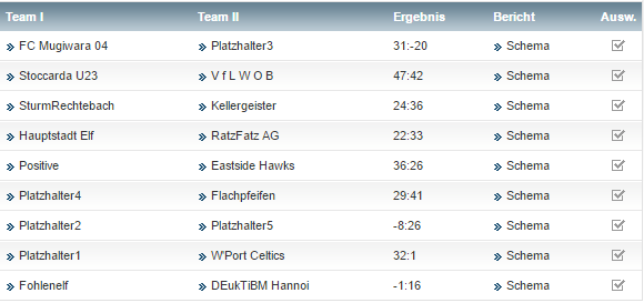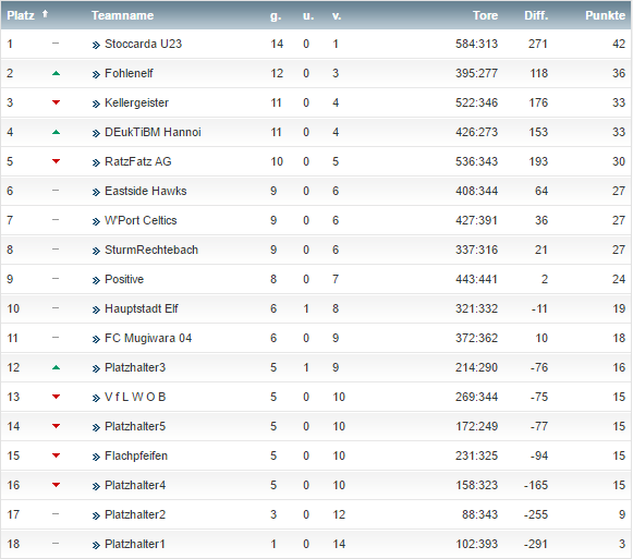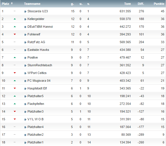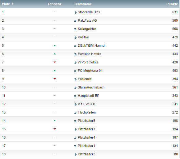 • Im gesicherten Tabellenmittelfeld liegen Sturm Rechtebach und die Hauptstadtelf. Nochmal in den Abstiegskampf hinein gezogen zu werden ist unwahrscheinlich, nochmal oben angreifen zu können ebenfalls. Um in der Rückrunde noch Sprünge in der Tabelle machen zu können sind unbedingt Transfers notwendig. Während Sturmrechtebach nach vorne keine Gefahr ausstrahlen kann (Stürmer gerade mal 31 Punkte zusammen), hat die Hauptstadtelf in der Abwehr klaffende Lücken (insgesamt 32 Punkte).
