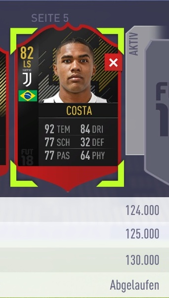 Dennoch ist die Praxis des teuren Aufkaufes eigentlich billiger Karten entsprechend meinen Beobachtungen die weitaus bevorzugtere. Hier haben wir z.B. eine Douglas Costa OTW Karte, die man im Normalfall auch um die 40k kaufen kann:
