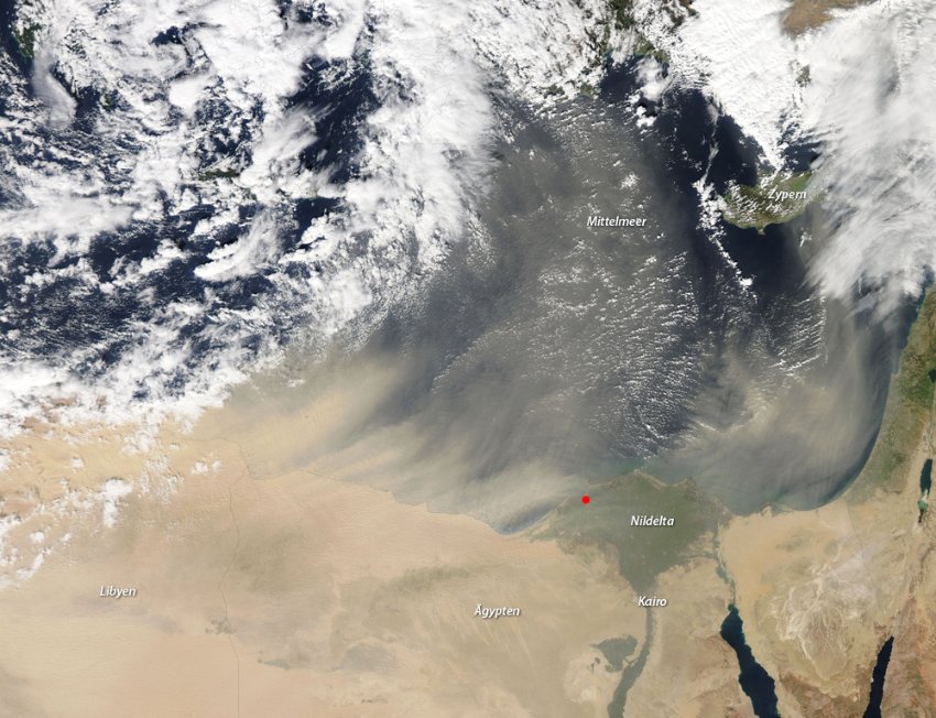Getrübter Blick vom Satelliten auf die Krisenregion Nordafrika: Gewaltige Staubstürme aus der Sahara*wehten in den vergangenen Tagen übers Mittelmeer bis nach Europa.*Menschen suchen Schutz, doch der Sandstrahl hat auch positive Folgen.